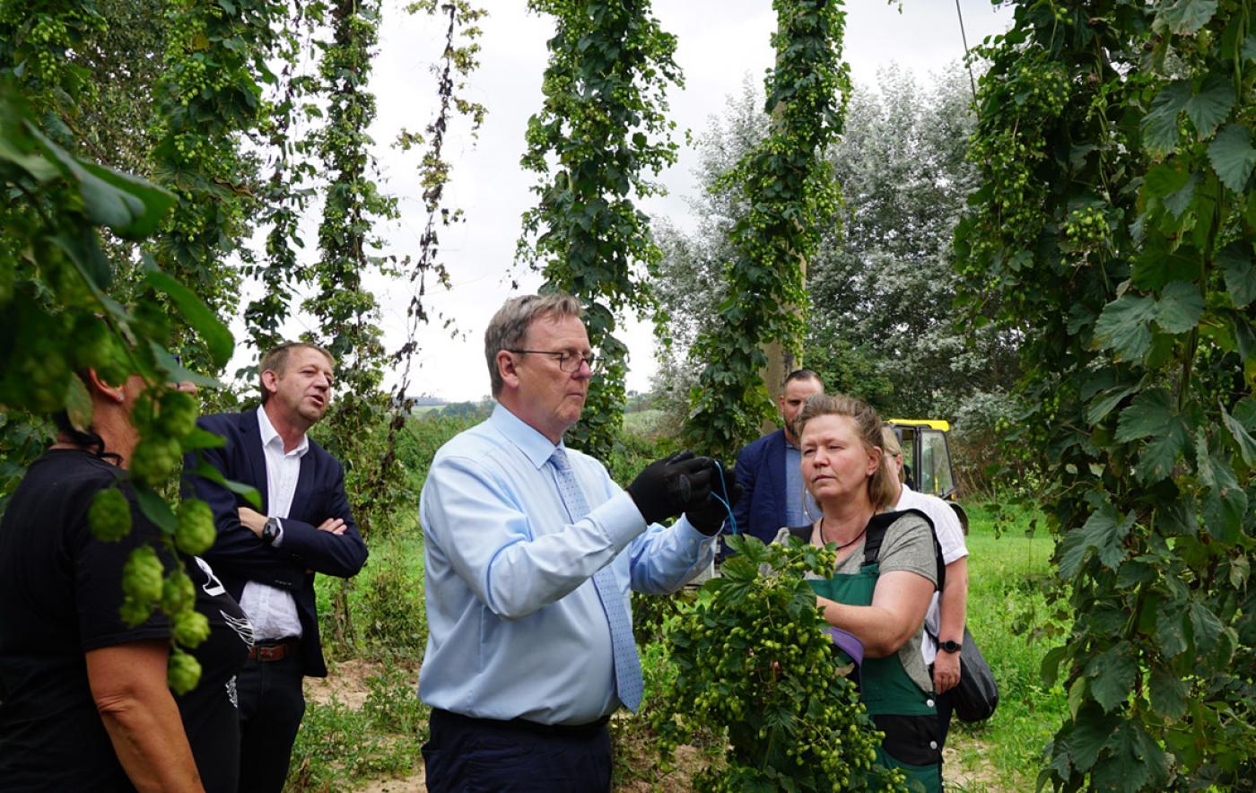 Die weitere Route führte die Teilnehmenden der Flurfahrt anschließend zu einem Hopfenfeld bei Heringen, wo die dortige Agrargenossenschaft Heringen auf etwa 50 Hektar Hopfen anbaut. Nach einer Vorstellung des Betriebes durch die Vorsitzende Betina Pietzer wurden Fragen rund um den Hopfenanbau, die Situation der Arbeitskräfte und den Mindestlohn diskutiert.