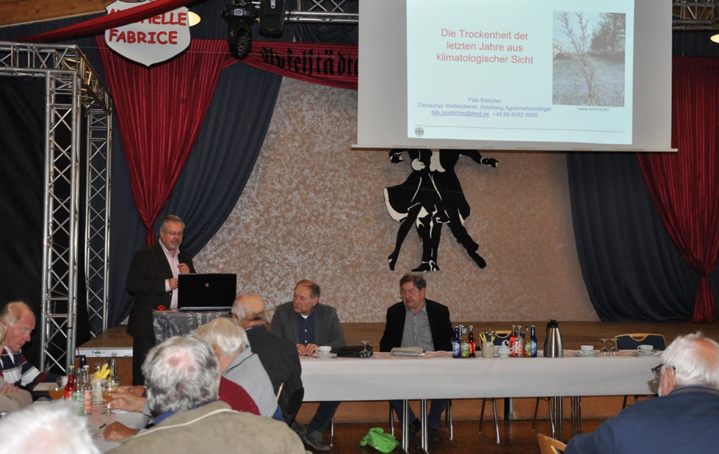 Falk Böttcher vom agrarmeterologischen Wetterdienst in Leipzig referierte über die Trockenheit der letzten Jahre. Interessant war, dass die Niederschlagsmenge gar nicht geringer ausgefallen war, lediglich die Verteilung über das Jahr war gerade mit Blick auf die Landwirtschaft ungünstig. Auch gab keinen gut wirkenden Landregen. Die Klimaveränderung bestimmte auch weiterhin die Tagesordnung. Bemerkbar macht diese sich vor allem in einer immer höheren Jahrestemperatur. Die Tage mit Hitzestress nehmen zu. Die Veränderung des Klimas hat auch Einfluss auf die Vegetation, die auch die Landwirtinnen und Landwirte bei ihrer Arbeit beachten müssen.
