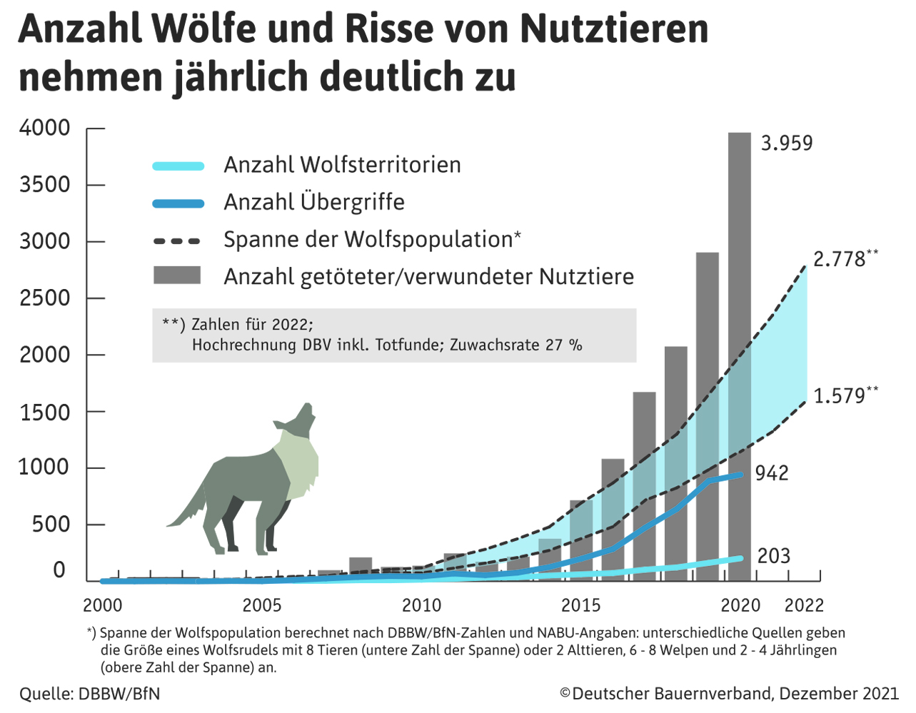 Seit Jahren steigt die Zahl der in Deutschland lebenden Wölfe. Infolgedessen nehmen auch die Wolfsübergriffe auf Weidetiere zu. Die Anzahl der verwundeten und getöteten Tiere ist von 40 im Jahr 2006 auf 3.959 Tiere im Jahr 2020 angestiegen. Während der digitalen Internationalen Grünen Woche stellte deswegen der Deutsche Bauernverband und das Aktionsbündnis Forum Natur ein Konzept für ein aktives Wolfsmanagement vor. Ziel des Modelles ist es, zunächst einen Akzeptanzbestand von Wölfen und darauf aufbauend eine Entnahmequote zu ermitteln.