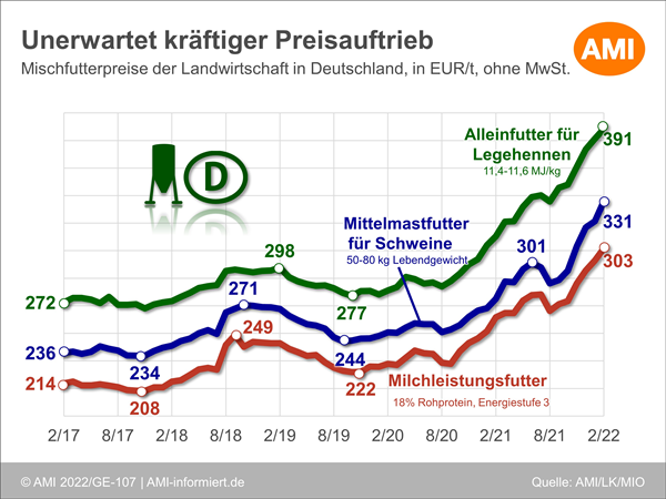 Aufgrund der anziehenden Preise für energie- und eiweißreiche Futterkomponenten kostet Schweinemischfutter im Durchschnitt 26 Prozent und Milchleistungsfutter 18 Prozent mehr als im Vorjahr. Besonders hohe Preissteigerungen verzeichnet Geflügelfutter: Während die Forderungen für Hähnchenmastfutter derzeit 22 Prozent über dem Vorjahresniveau liegen, stiegen die Preise für Legehennen- und Putenmastfutter innerhalb eines Jahres sogar um 24 bzw. 31 Prozent.